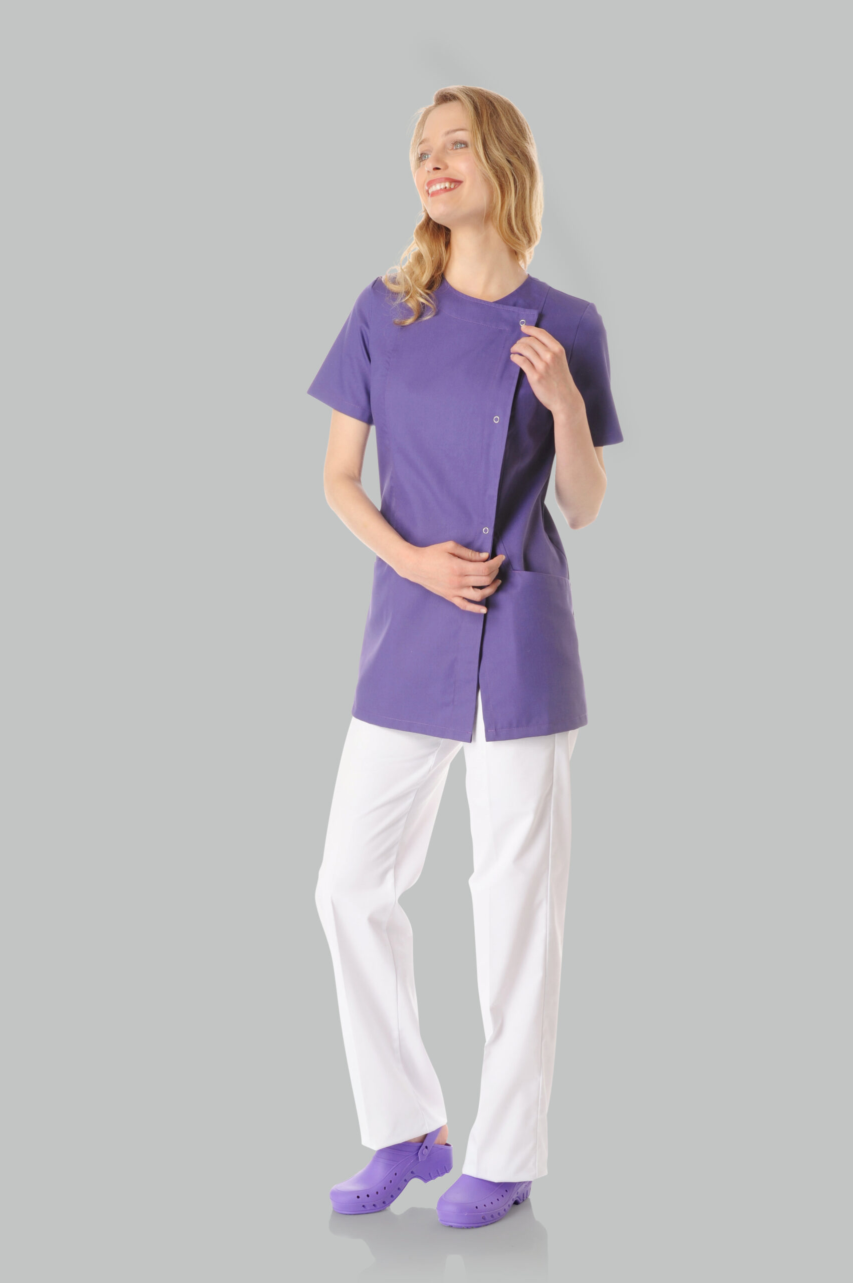 L’originalité de ce vêtement médical réside dans son jeu de textures. Sur le modèle blanc, on apprécie la bi-matière sur le devant. Ce détail réhausse l’effet asymétrique très contemporain de la pièce. Sa fermeture asymétrique à pressions apporte une touche de sophistication. Elle transforme cette blouse médicale en une tenue de travail haut de gamme.