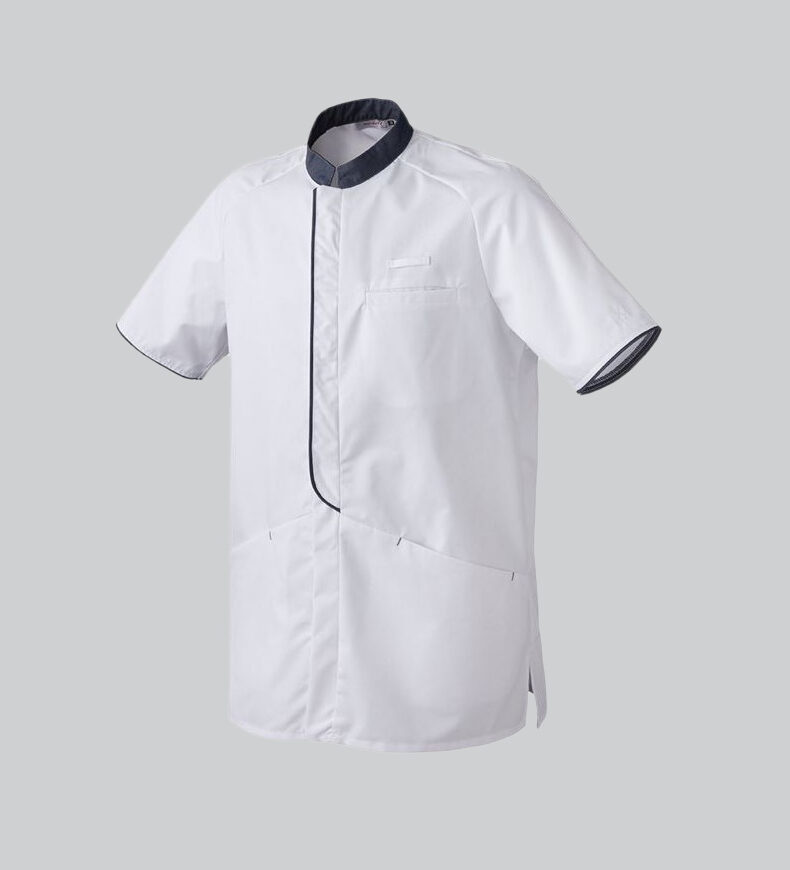 - Plastron avec liseré : Le plastron est souligné par un liseré contrasté, ajoutant une touche moderne à la veste de cuisine